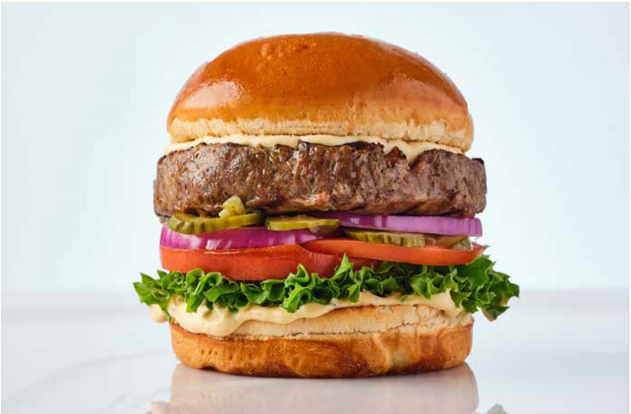 همبرغر 110 جرام من لحم عجل طازج 100%خردل ايولي، خيار مخلل، خس، بندورة وبصل أحمر