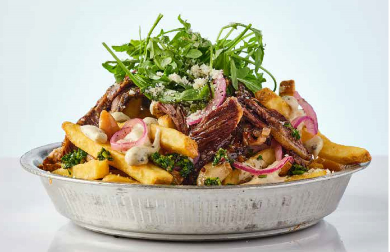 طبق تشيبس مع اسادو مدخن - ثوم كونفي - بصل مخلل- شمينت فلفل تشيمتشوري - جرجير - جبنه بارميجان