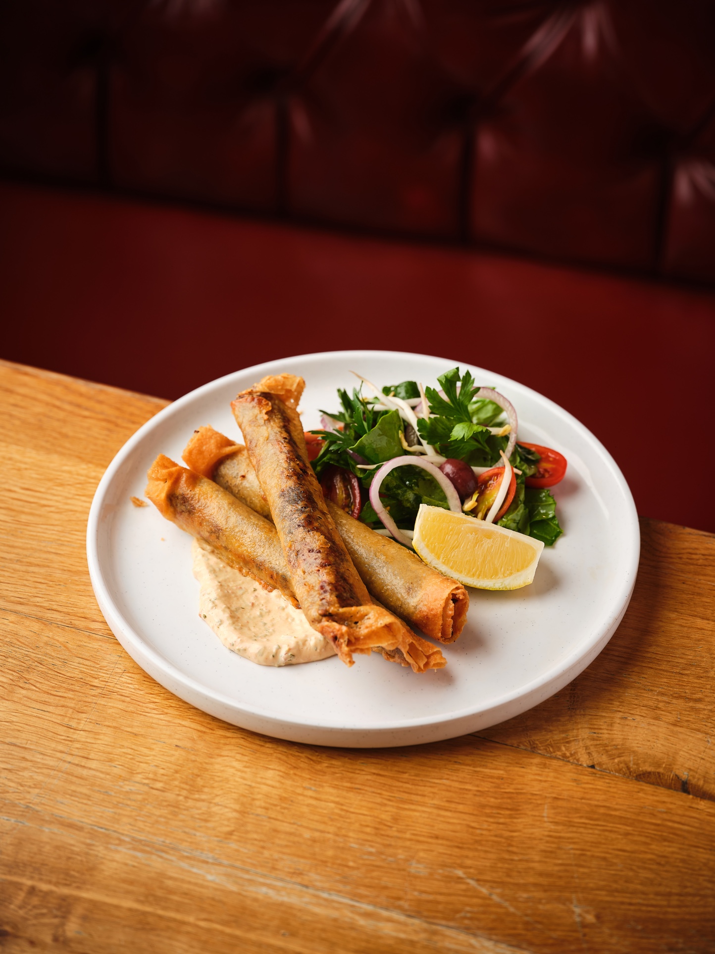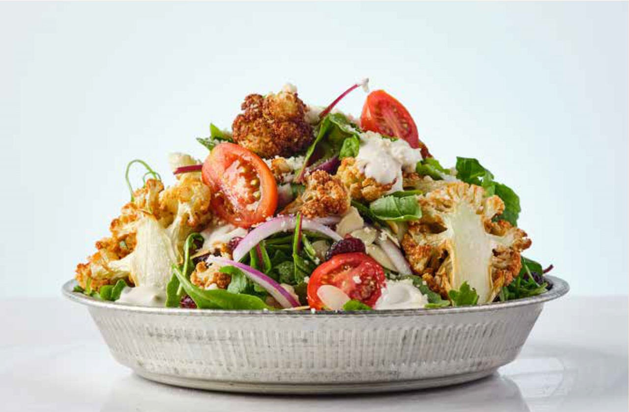 زهرة قرنبيط مع صلصة اللبنه والطحينه ، شيري ، زتون كالماتا ، بصل ، توت بري مجفف ، لوز ، جبنة البرمجان, جبنه الفيتا ، جرجير, فينيجرت رمان