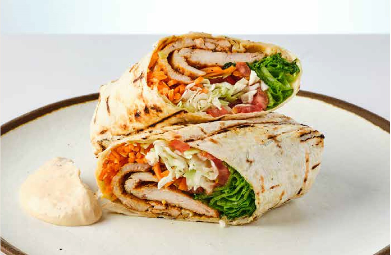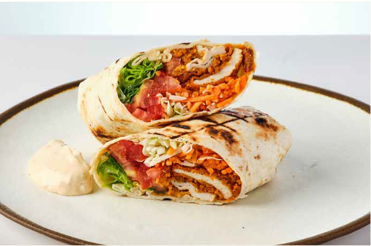 شنيتزل، خس، بندورة، صلصة ترتار و تشيلي في خبز تورتيلا.