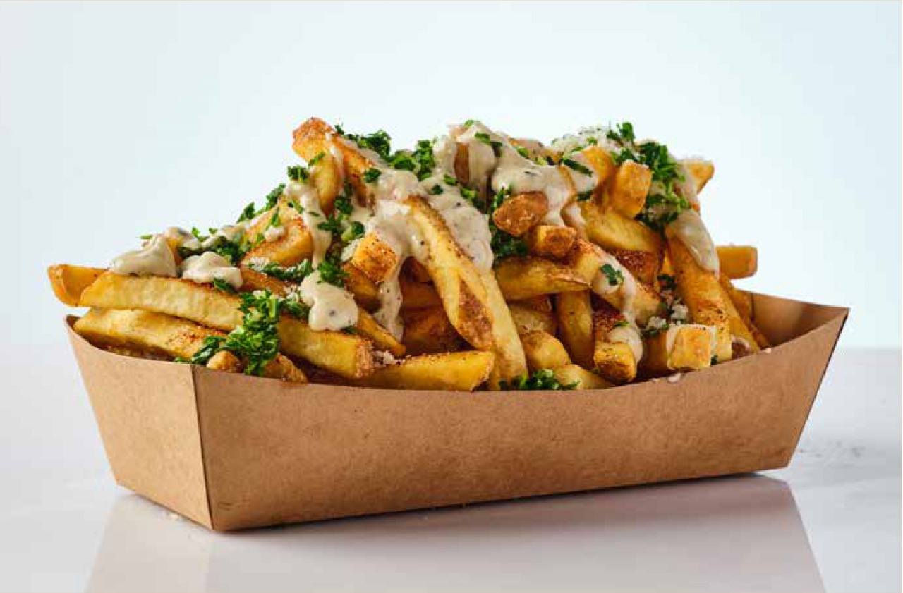تشبيس، مع توابل وبهارات كيجين، تقدم مع رقائق جبنة البارميجان، الثوم والبقدونس وصوص الشمينت والفلفل