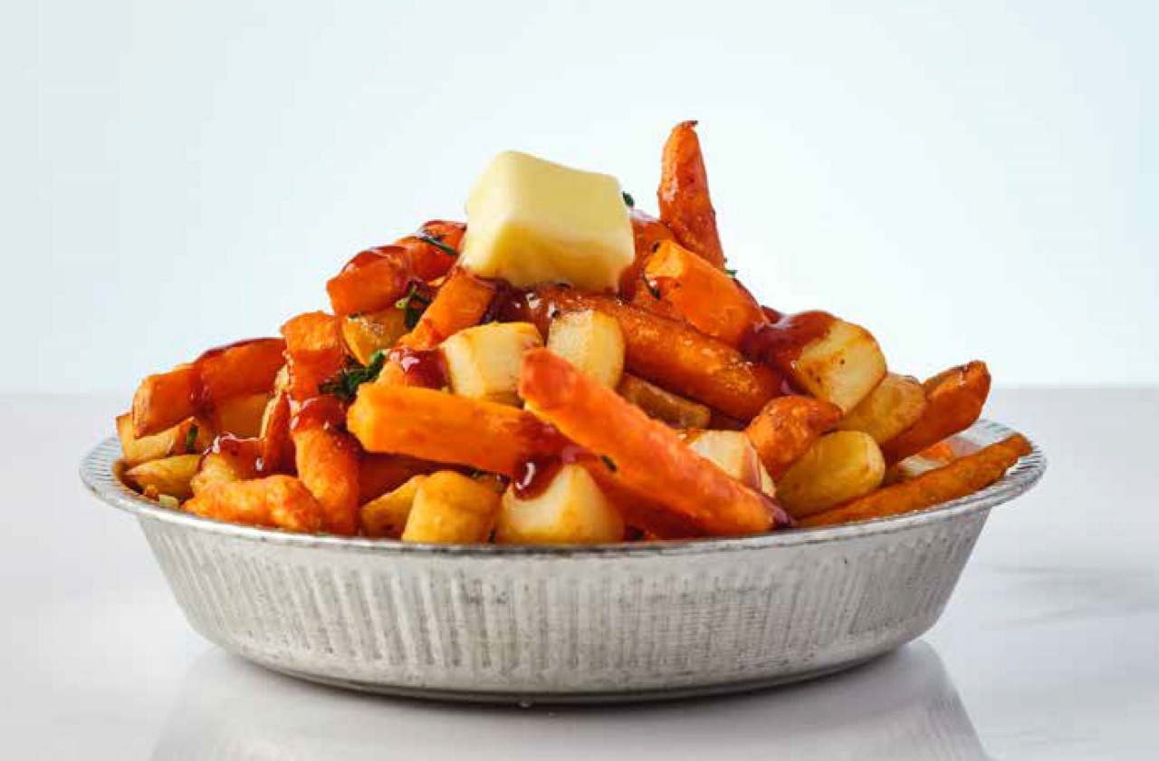 بطاطا حلوة مقطعة، وبطاطا، في صلصة التشيلي ترياكي مع ثوم وبقدونس والزبدة