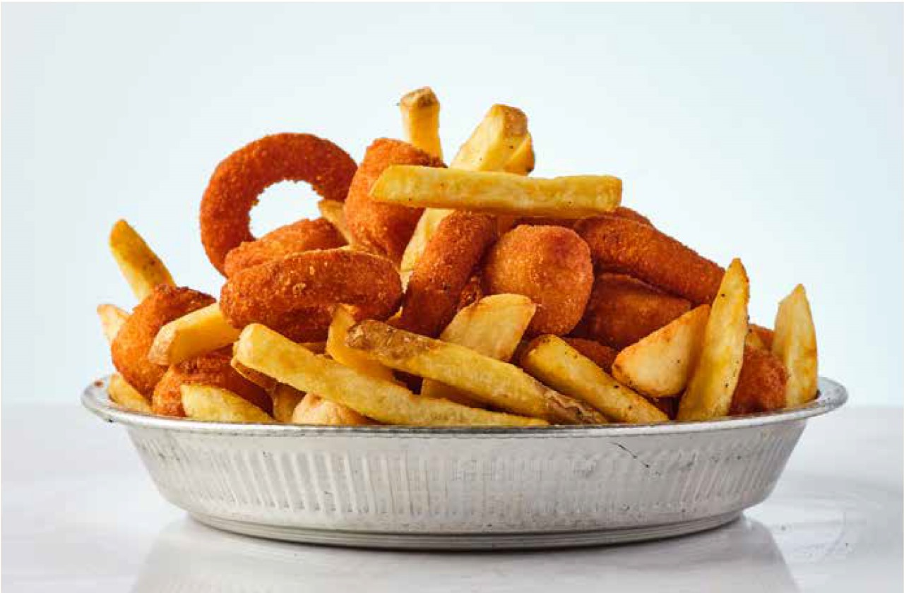 رقائق بطاطس ، حلقات بصل، كرات بطاطس مهروسة، متبلة بتوابل كيجن