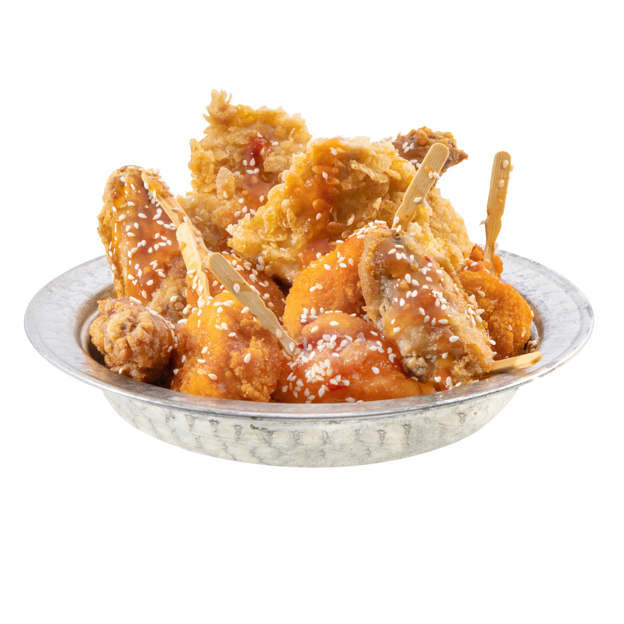 عيدان الدجاج المقرمش، أجنحة مقلية، شرائح الدجاج مع الأرز المقرمش، مع صلصة التشيلي والسمسم