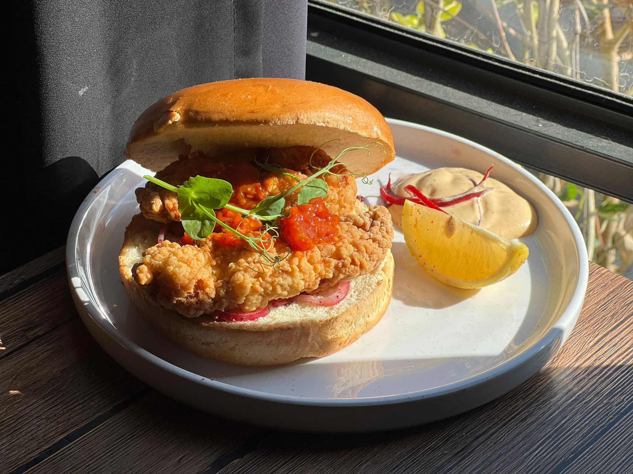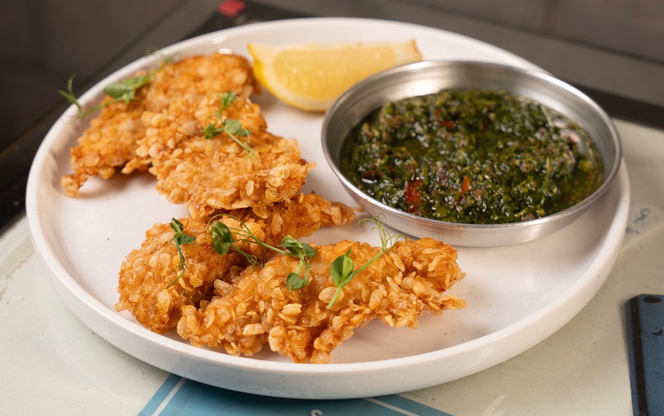 صدر دجاج مقلي باألرز المقرمش، تشيميتشوري، تشيلي، سمسم، خس، بندورة، سلطة الترتار مع الميونز * بامكانكم طلب خبزة خالي من الجلوتين مقابل دفع 7₪