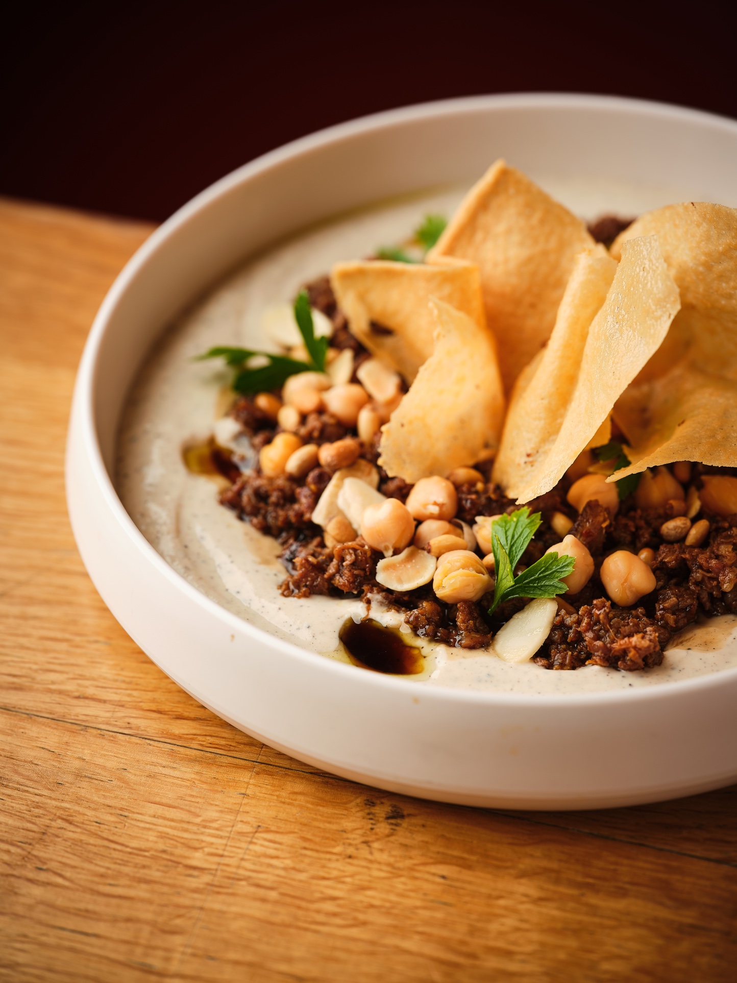 فتة بل لحمة والاسادو بنكهة حارة خفيفة - طحينة يوجورت - حمص حب - لوز - صنوبر - زيت زيتون - دبس رمان - وكلاج مقلي