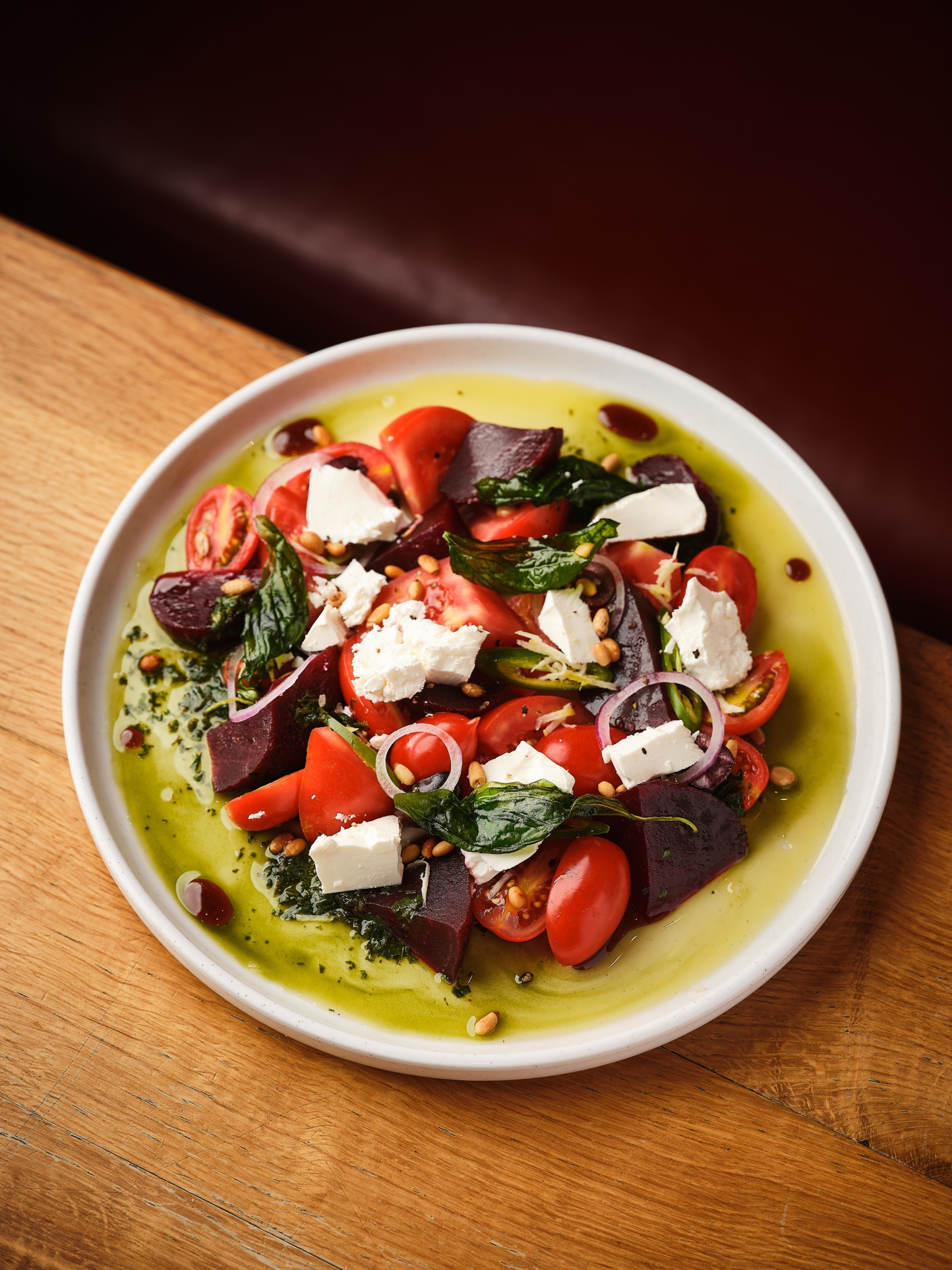 سلطتنا مكونه من بندوره - بندوره شيري - ليفت احمر مع البصل الاحمر والفلفل الحار - بيستو - شرائح ليمون - مع زيت الزيتون والريحان