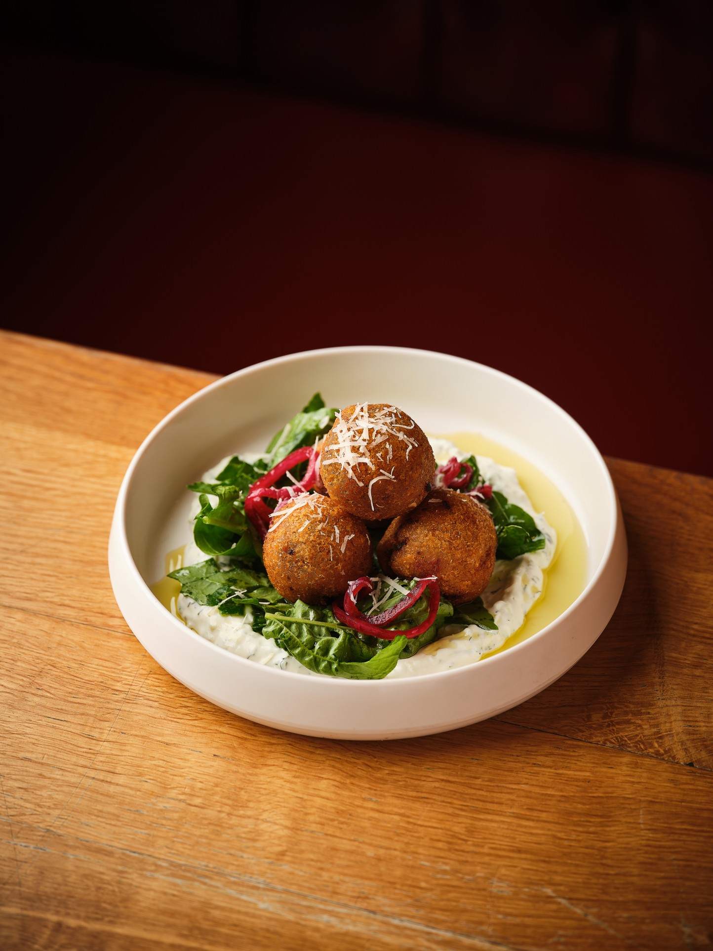 4 حبات كبه محشية باسادو مدخن مع لحم العجل الطازج تُقدم مع صلصة االسيزيكي مع جرجير وبصل حامض وجبنة البرمجانواليمون