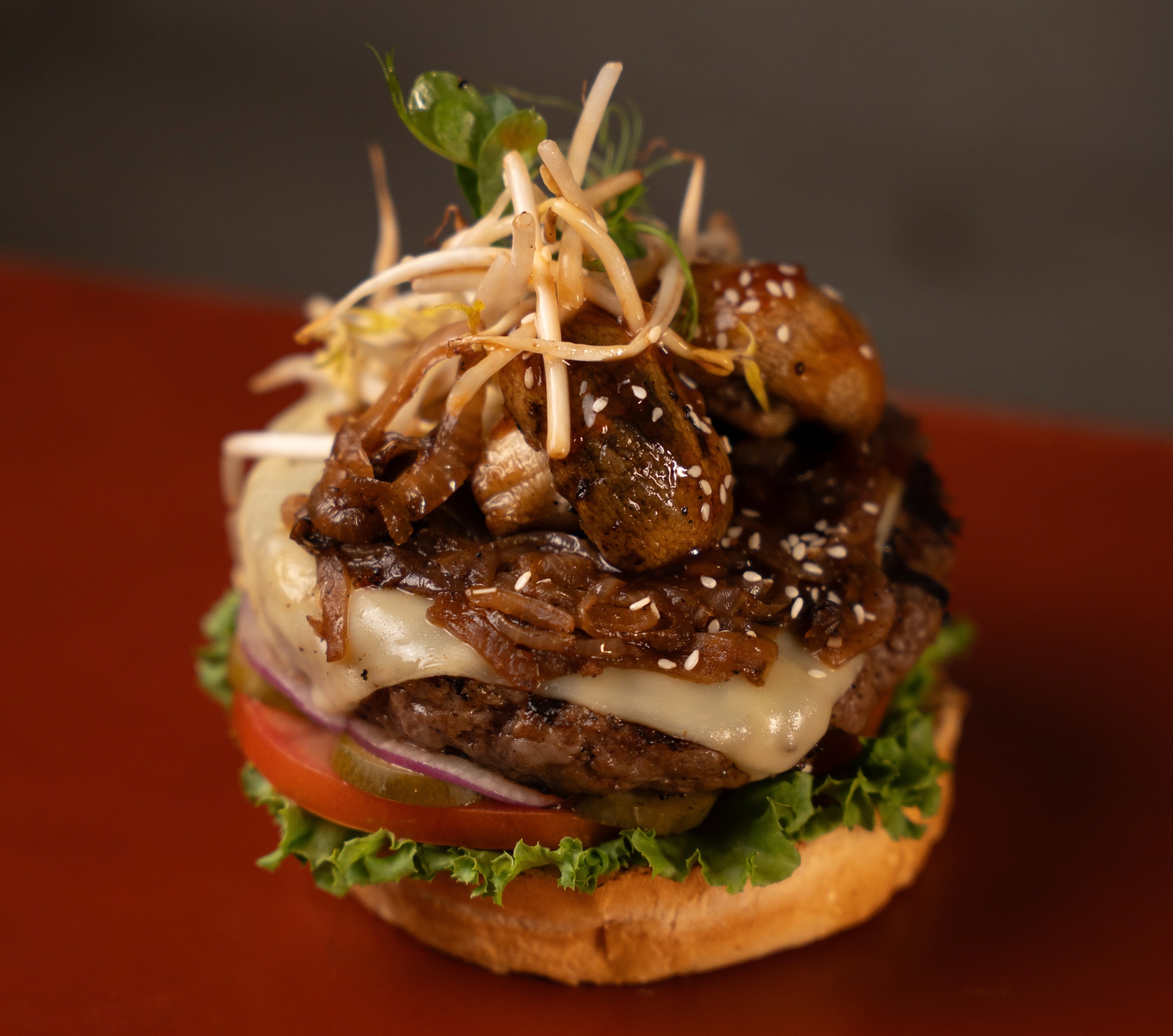 همبرغر 150 جرام من لحم البقر الطازج 100%جبنة جودة، فطر مقلي، بصل مقلي، براعم صينية، تشيلي ترياكي الحار، سمسم خردل أيولي، خس، بندورة، بصل أحمر ومخلل.* بامكانكم طلب خبزة خالي من الجلوتين مقابل دفع 7₪
