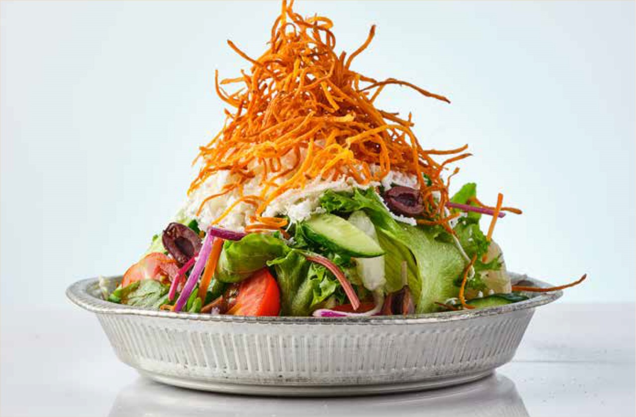 جبنة فيتا، بندورة شيري ، خيار، بصل أحمر، زيتون كالاماتا، رقائق بطاطا حلوة، مع صلصة فينيجرت نعنع. اكسترا: فيتا 10₪ | حلومي 15₪ | دجاج 15₪ | ارتيشوك 15₪