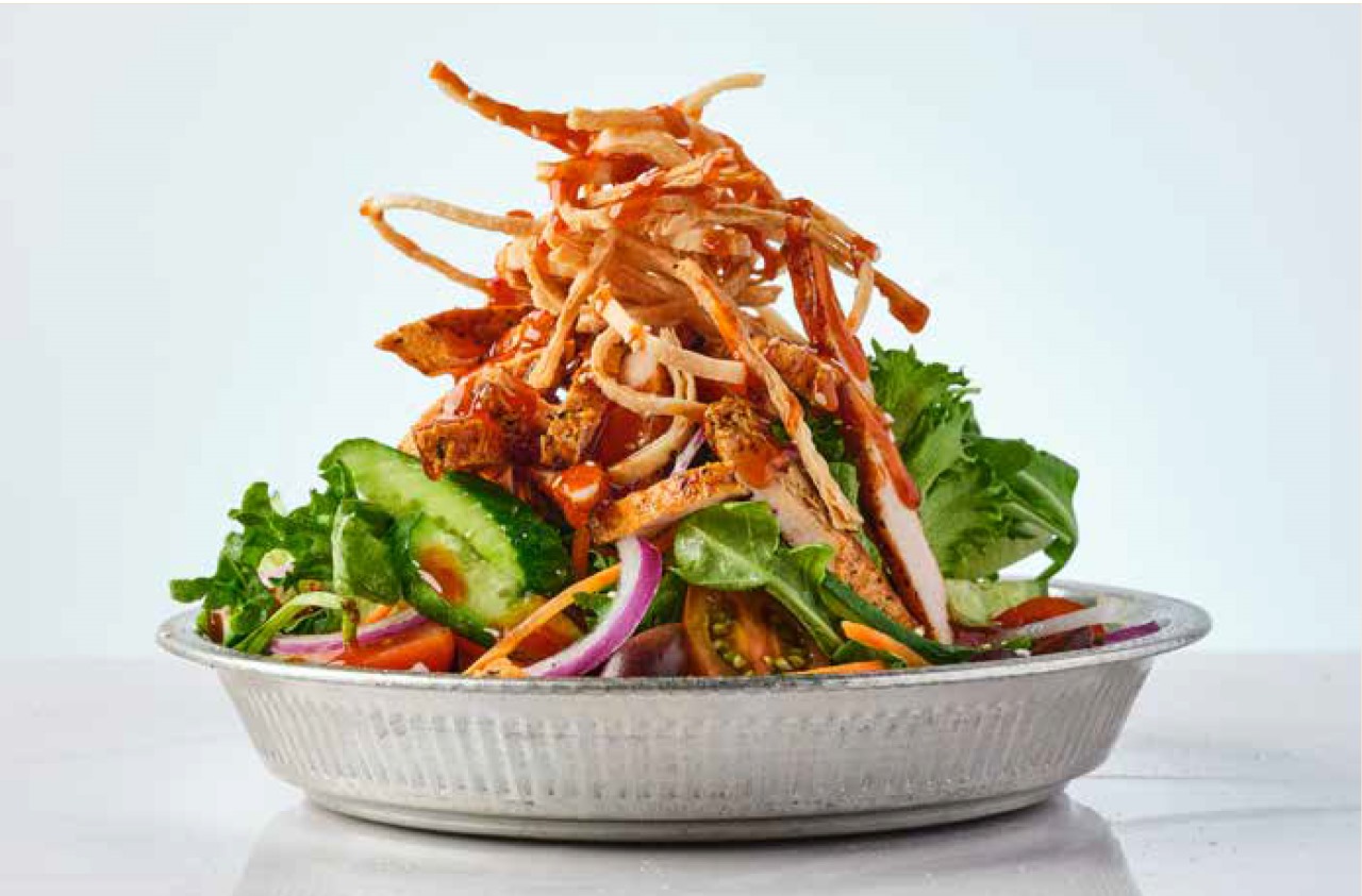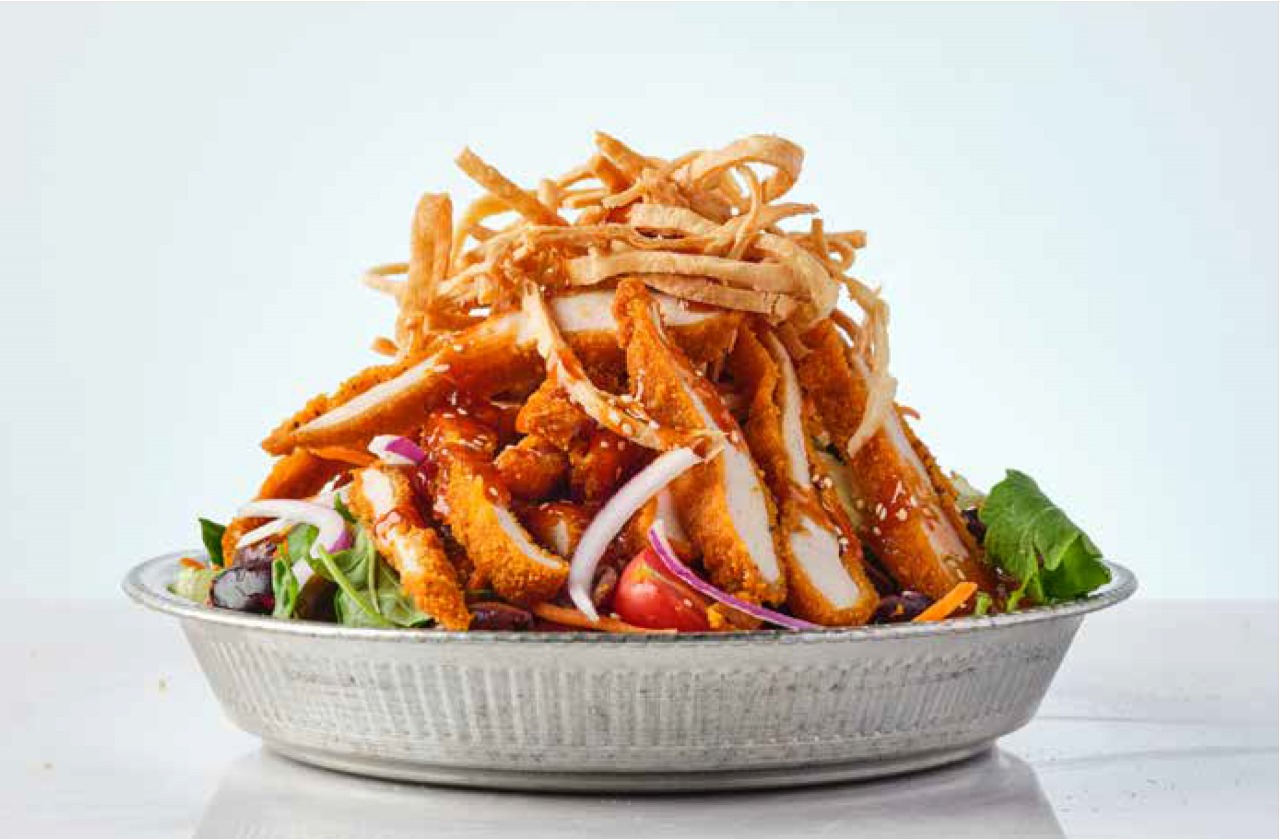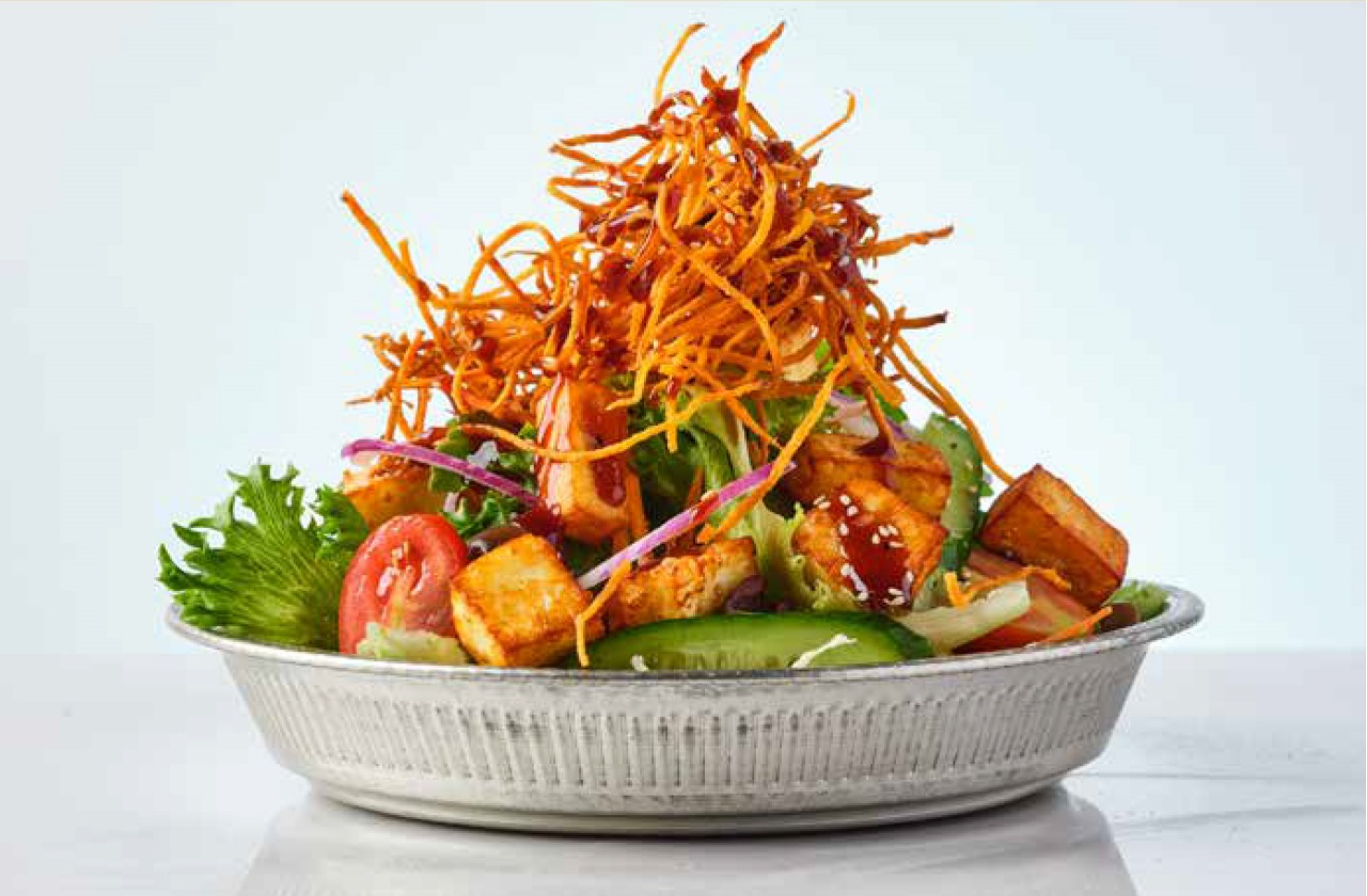 بنة حلومي مقلية، شيري، زيتون كالاماتا، بصل أحمر، خليط خس، فلفل ترياكي الحار، سمسم، صلصة فينيجريت نعنع ورقائق بطاطا كرسبي اكسترا: فيتا 10₪ | دجاج 15₪