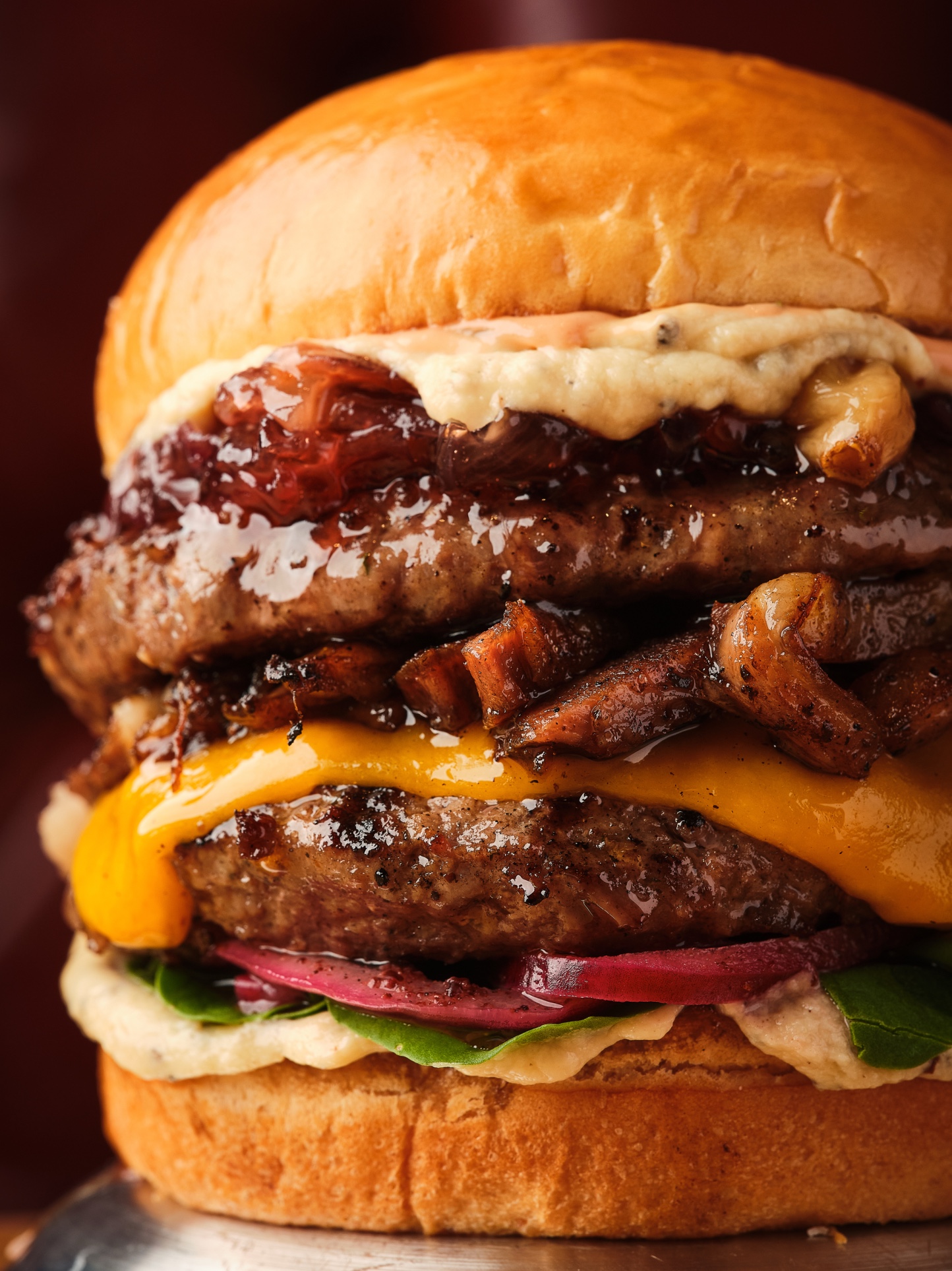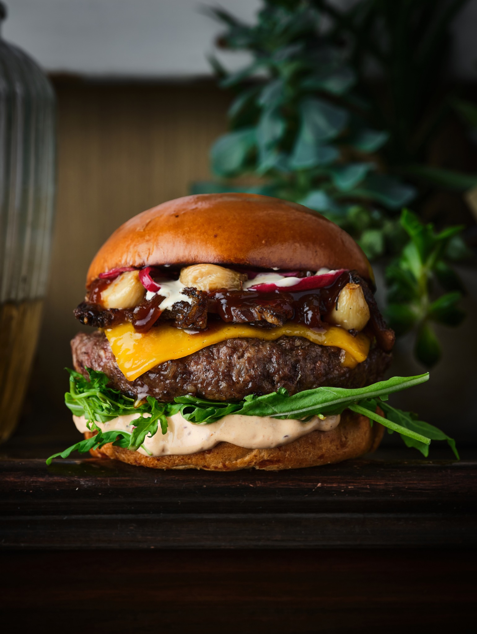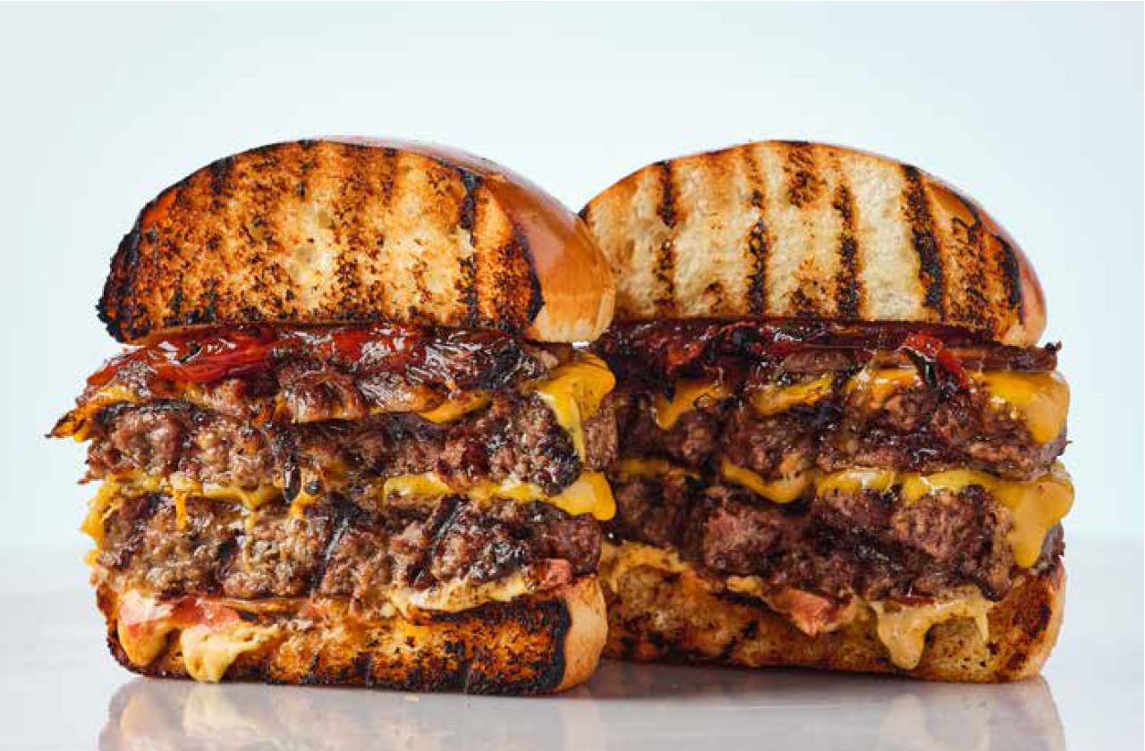 مكونة من 220 غرام لحمة عجل ، محشي بجبنة التشيدر والأسادو المُدخن ،تطلة البصل وشمينت الفلفل تُقدم مع الجرجير والثوم الكونفي