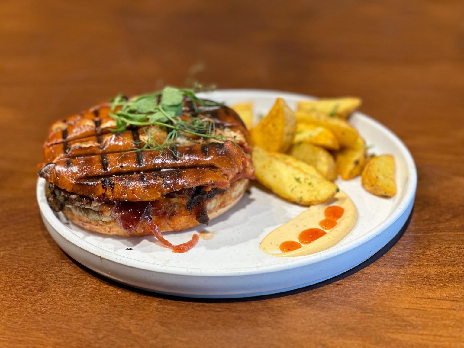 لحمه عجل  طازج سماش 150 غرام   , بانتشيتا خروف , ايولي خردل , جبنه تشيدر , بندوره مطبوخة , تطلة البصل , بصل مخلل ,باربيكيو ,
